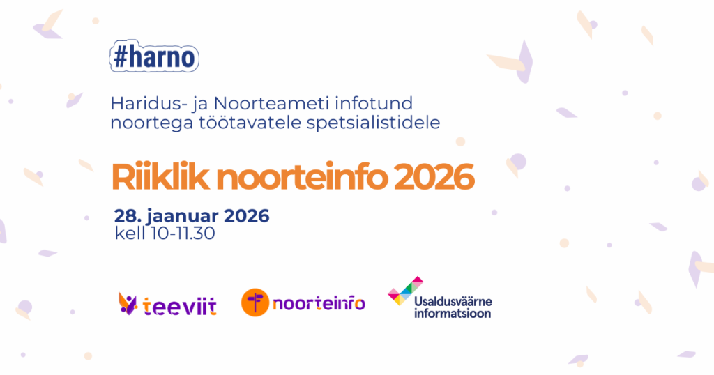 28.01.2026 kell 10.00-11.30 toimub veebipõhine infotund, kus Haridus- ja Noorteamet tutvustab 2026. aasta planeeritavaid noorteinfo tegevusi, juhend- ja tugimaterjale ja Teeviit teemakuud 2026 plaani ning küsitluse kokkuvõtet.