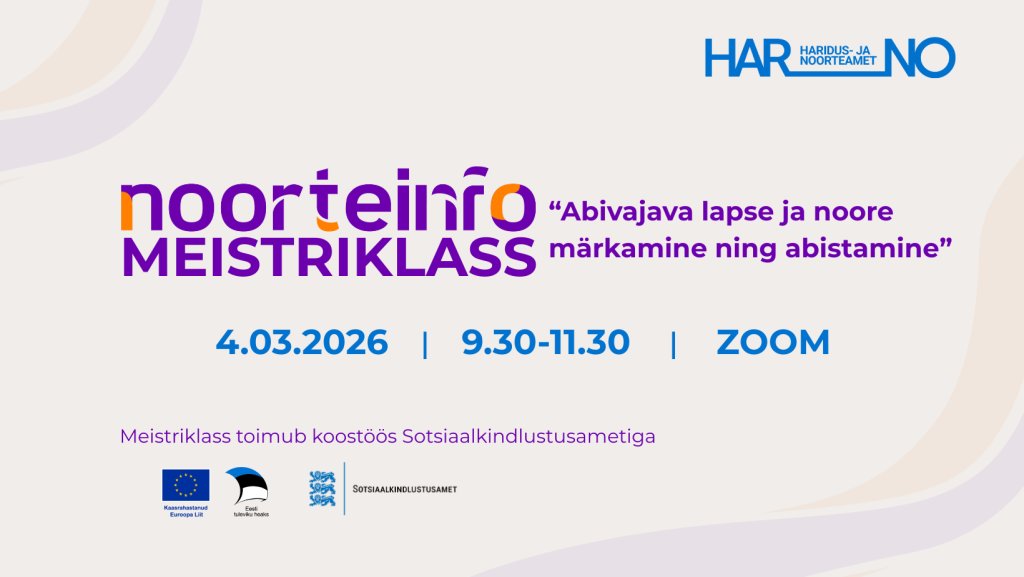 Haridus- ja Noorteamet kutsub koostöös Sotsiaalkindlustusametiga noortega töötavaid spetsialiste 4.03.2026 kell 9.30-11.30 osalema noorteinfo meistriklassis “Abivajava lapse ja noore märkamine ning abistamine”. Meistriklass toimub Zoomis ja seda salvestatakse.