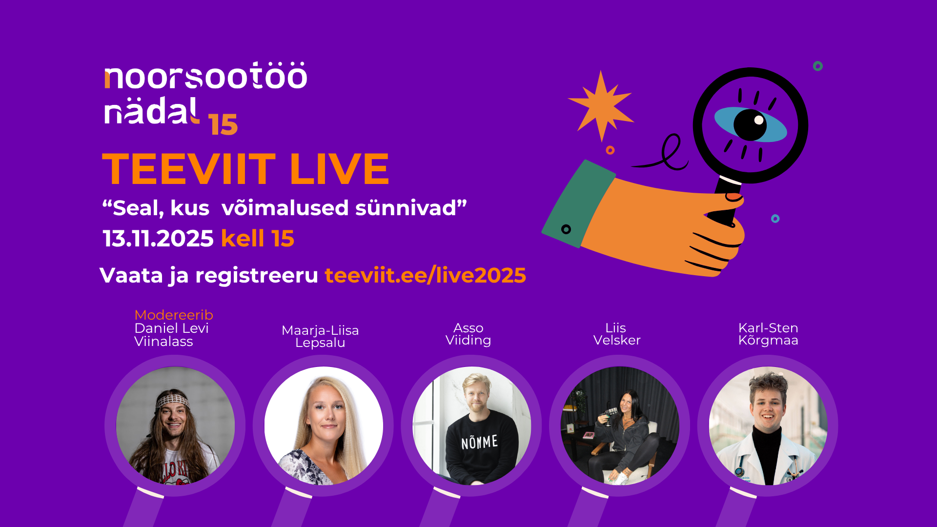 Kui tahad saada inspiratsiooni ja rohkem teadmisi noorsootöö olulisusest, siis osale veebisündmusel Teeviit LIVE 13. novembril 2025 kell 15-17. Neli põnevat külalist vestlevad muusiku Daniel Levi Viinalassiga.